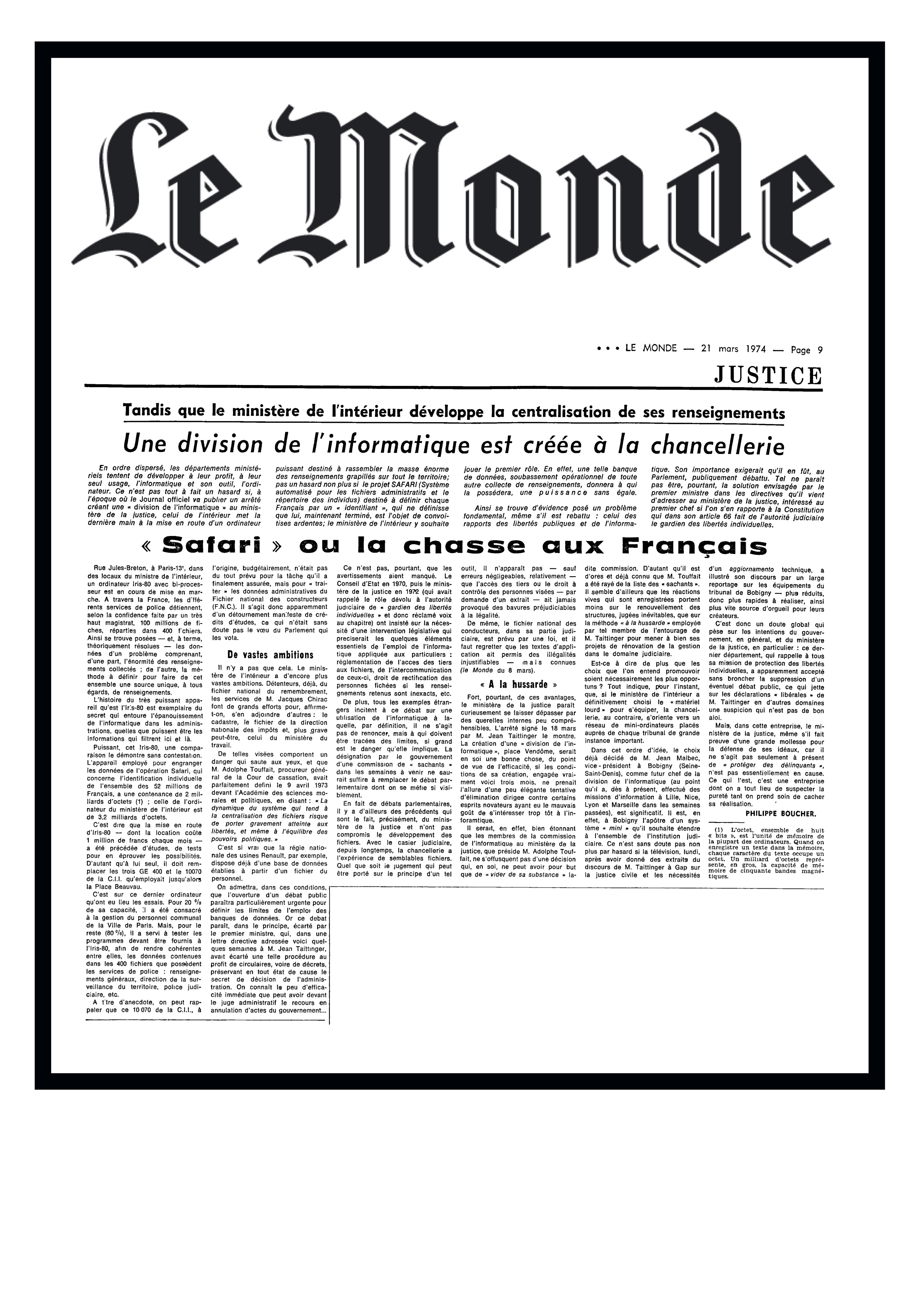 - 🇫🇷 On 21 March 1974, French newspaper Le Monde publishes ‘”Safari” ou la chasse aux Français’, an article by Philippe Boucher alerting of plans for a nationwide database. The article triggers numerous reactions, which will eventually lead to the adoption of a law on ‘computers & freedoms’ (informatique et libértés).