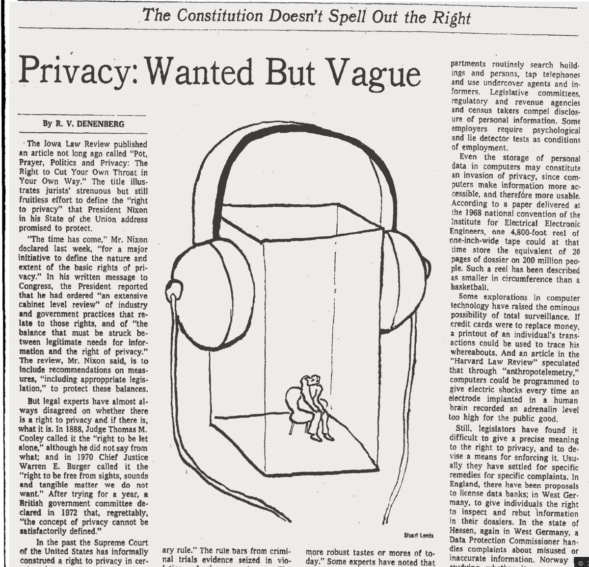 - Denenberg, R. V. (1974), ‘Privacy: Wanted But Vague. The Constitution Doesn’t Spell Out the Right’, The New York Times, 3 February 1974.