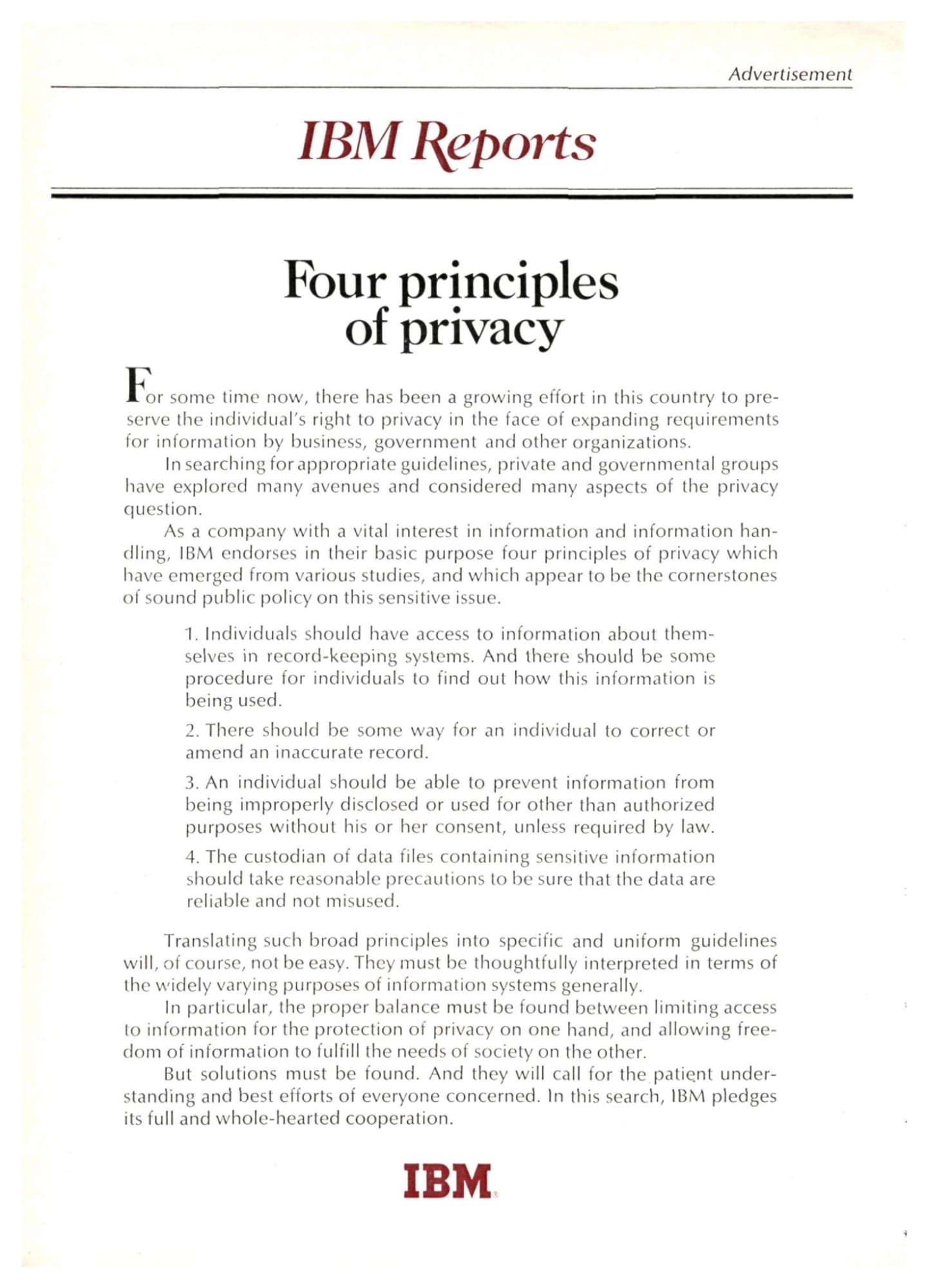 - IBM publishes in Newsweek an ad endorsing ‘Four principles of privacy’.