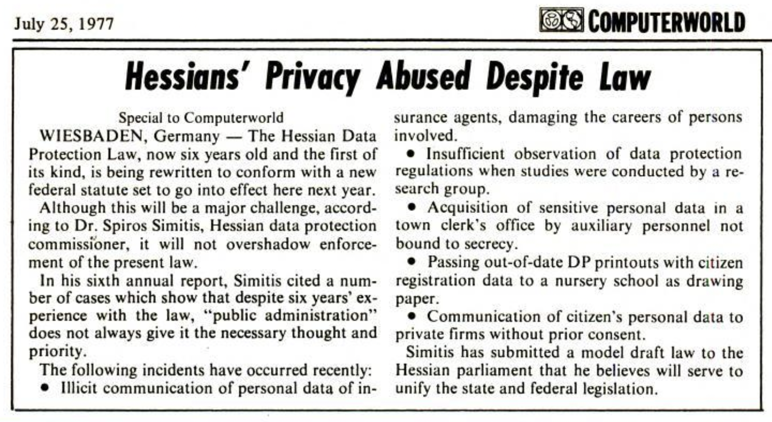 - ‘Hessians Privacy Abused Despite Law‘, Computerworld, 20 July 1977, 13.