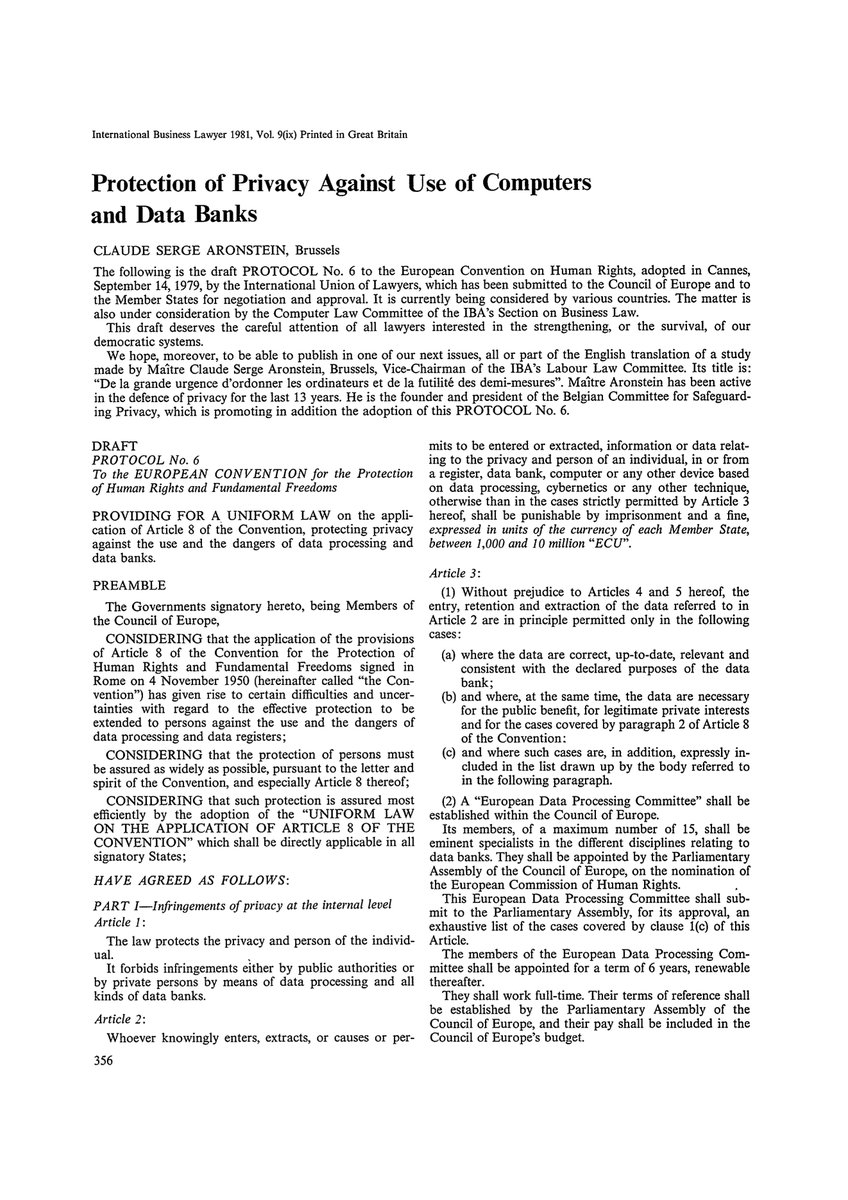 - A draft Protocol to the European Convention on Human Rights, on the Protection of Privacy Against Use of Computers and Data Banks, is proposed by the International Union of Lawyers.