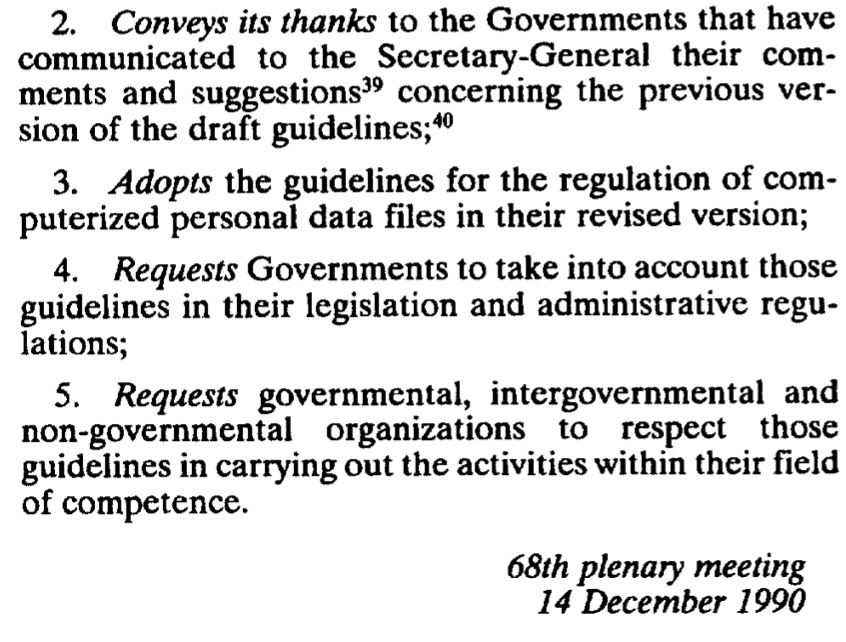 - 🇺🇳 On 14 December 1990 the General Assembly of the United Nations (UN) adopts its Guidelines for the Regulation of Computerized Personal Data Files (Resolution 45/95).