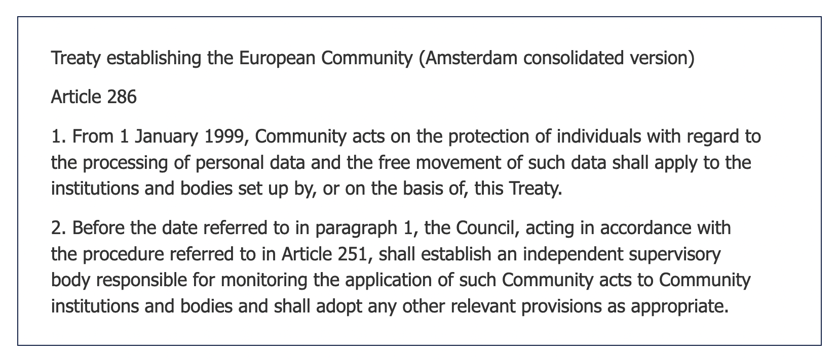 - In May 1999 enters into force the Treaty of Amsterdam, which integrates a new Article 286 in the Treaty establishing the European Community.